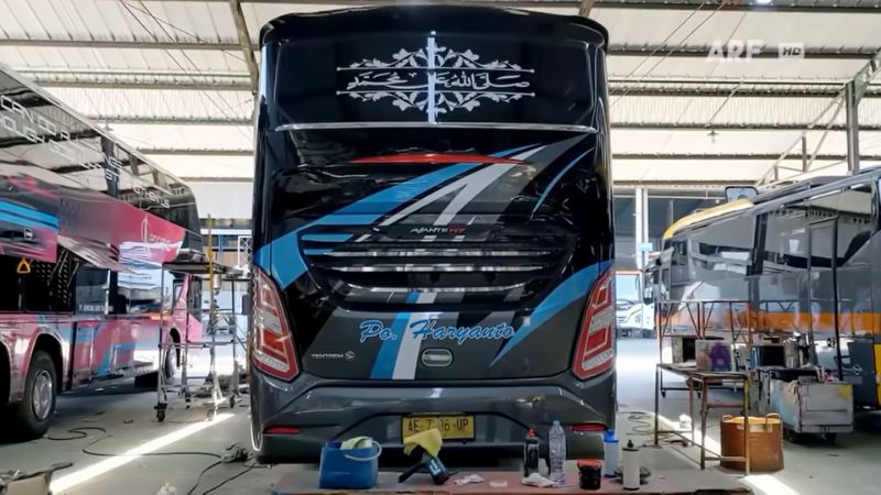 Tampak belakang bodi terbaru Avante H7 Facelift bus PO Haryanto saat dikerjakan Karoseri Tentrem. [Foto: Dok. Tangkapan layar YouTube/ARF Bus Channel]