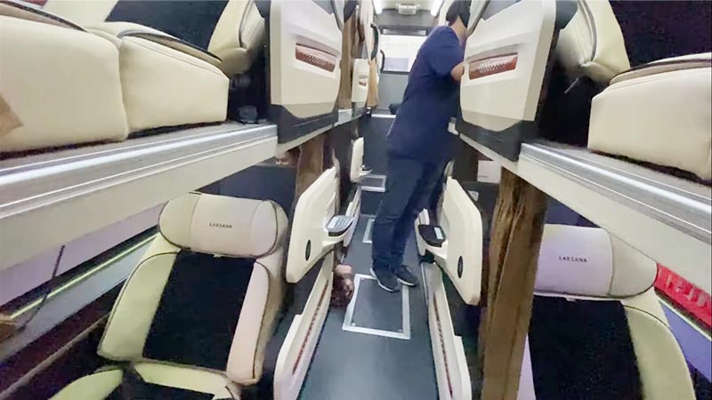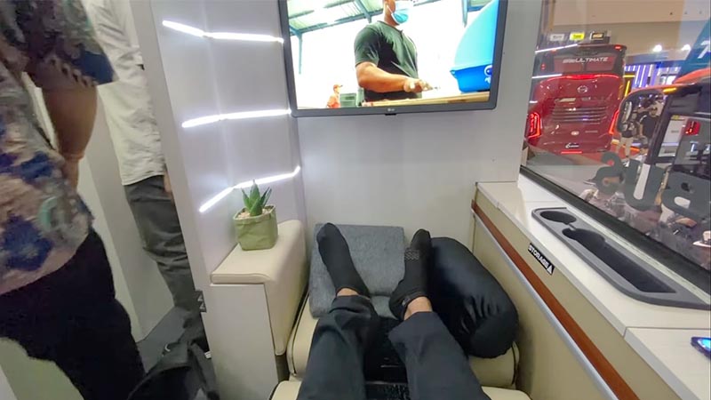 Bukan sekedar itu saja, di setiap sisinya sudah disediakan TV LED untuk menikmati hiburan selama perjalanan, seperti nonton film dan lain-lain. Ada meja makan, port USB untuk mengisi smartphone Anda, cup holder, meja penyimpanan bantal selimut dan lain sebagainya. Pokoknya nyaman banget.