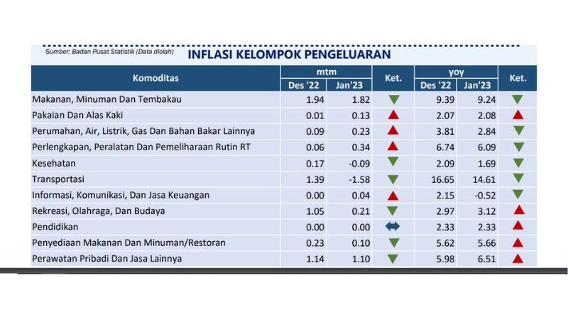 Menurut BPS, inflasi yang terjadi pada bulan Januari menurun dibandingkan Desember 2022 sebesar 0.94% (mtm). Sementara untuk inflasi tahunan Sumbar pada Januari 2023 tercatat 6,81% (yoy), juga mengalami penurunan dibandingkan Desember 2022 sebesar 7,43% (yoy), namun meningkat jika dibandingkan dengan Januari 2022 sebesar 2,30% (yoy) atau secara tahunan.