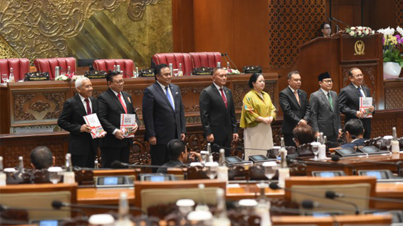 Wakil Ketua DPR RI Lodewijk F. Paulus dalam foto bersama usai menyampaikan buku laporan kinerja DPR RI selama tahun sidang 2022-2023 dalam Rapat Paripurna di Gedung Nusantara II, Senayan, Jakarta, Selasa (29/8/2023). Foto: Dok. DPR RI/ Arief]