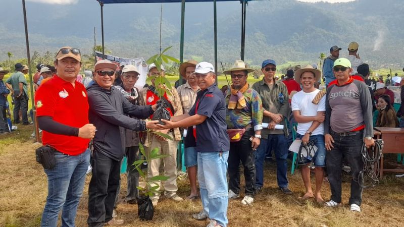Ketua Harian Porbbi Sumbar Niko Adrian menyerahkan bibit pohon yang bakal ditanam di sekitar perbukitan di Nagari Koto Kaciak, Agam. [Foto: Dok. Kabapedia.com]