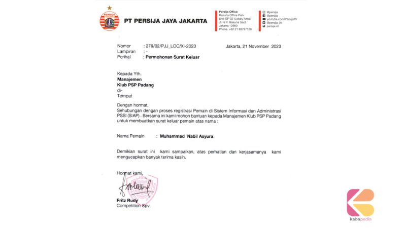 “Secara klub anggota PSSI, Nabil Asyura terakhir memang terdaftar di PSP Padang U-15 ketika juara 3 nasional Piala Soeratin musim 2021/2022. Karena ini, Persija meminta surat permohonan keluar kepada kami manajemen PSP Padang,” beber Harris Hidayat, Rabu (29/11/2023) sore.