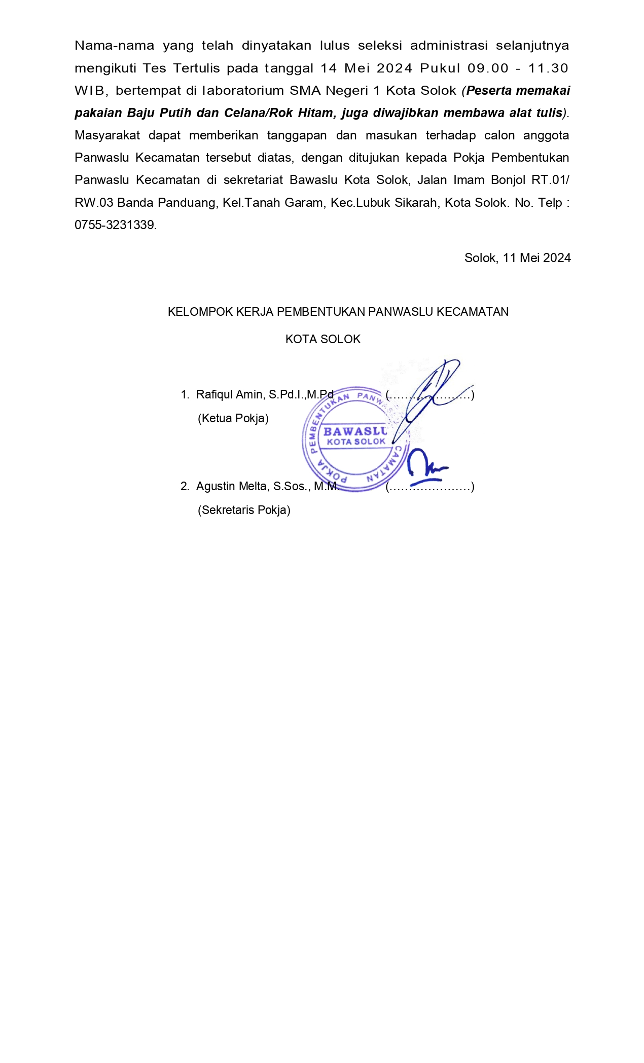 Nama-nama yang telah dinyatakan lulus seleksi administrasi selanjutnya mengikuti Tes Tertulis pada tanggal 14 Mei 2024 Pukul 09.00 – 11.30 WIB, bertempat di laboratorium SMA Negeri 1 Kota Solok (Peserta memakai pakaian Baju Putih dan Celana/Rok Hitam, juga diwajibkan membawa alat tulis).